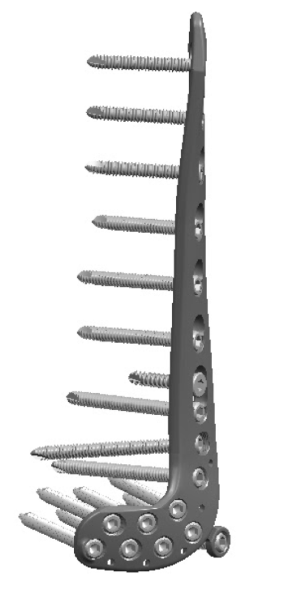 The proximal humerus locking plate has a symmetrical design, allowing it to be used on both the left and right side. The head of the locking plate is designed to conform to the contour of the neck and head of the humerus.